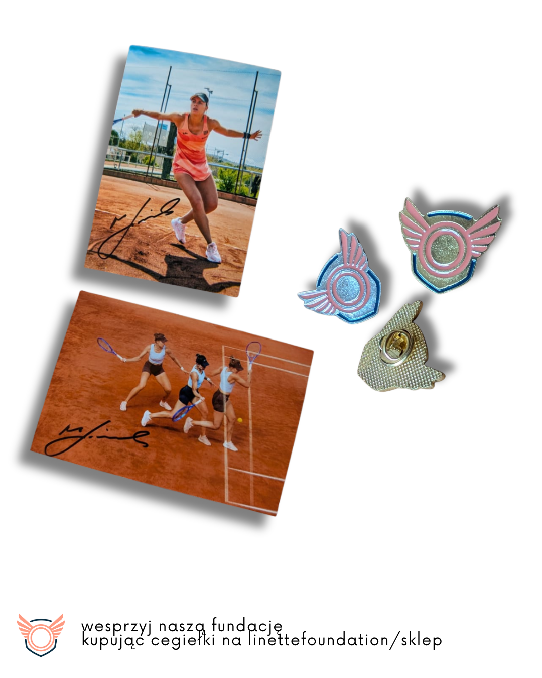 Zestaw “Pin + zdjęcie z autografem Magdy Linette” to unikalna okazja, by wesprzeć Fundację Magdy Linette i jednocześnie stać się właścicielem wyjątkowej pamiątki. W skład zestawu wchodzi przypinka z logo Fundacji oraz zdjęcie Magdy Linette z jej własnoręcznym autografem. Każdy zakup tego zestawu to nie tylko wyraz wsparcia dla misji Fundacji, ale także pomoc w realizacji projektów rozwijających młode talenty. Wybierz swoje ulubione zdjęcie i pin, a razem z nami pomagaj realizować marzenia!